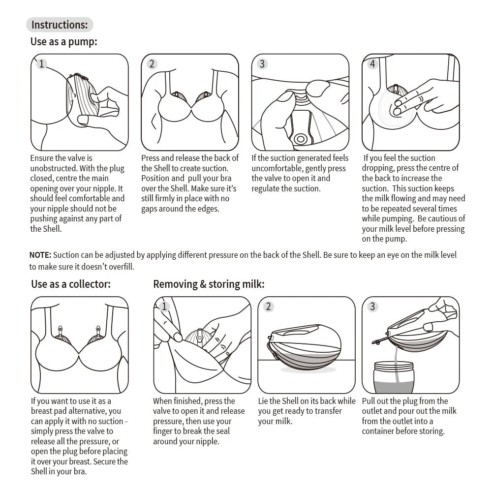 ¿Solo quieres recolectar la leche que gotea? Sin problema. Retira el tapón para eliminar la succión, pon la Shell en tu sostén y deja que recoja de forma pasiva esas gotitas valiosas de oro líquido. Su base plana evita derrames y su salida de fácil vertido te permite transferir la leche sin perder ni una gota.